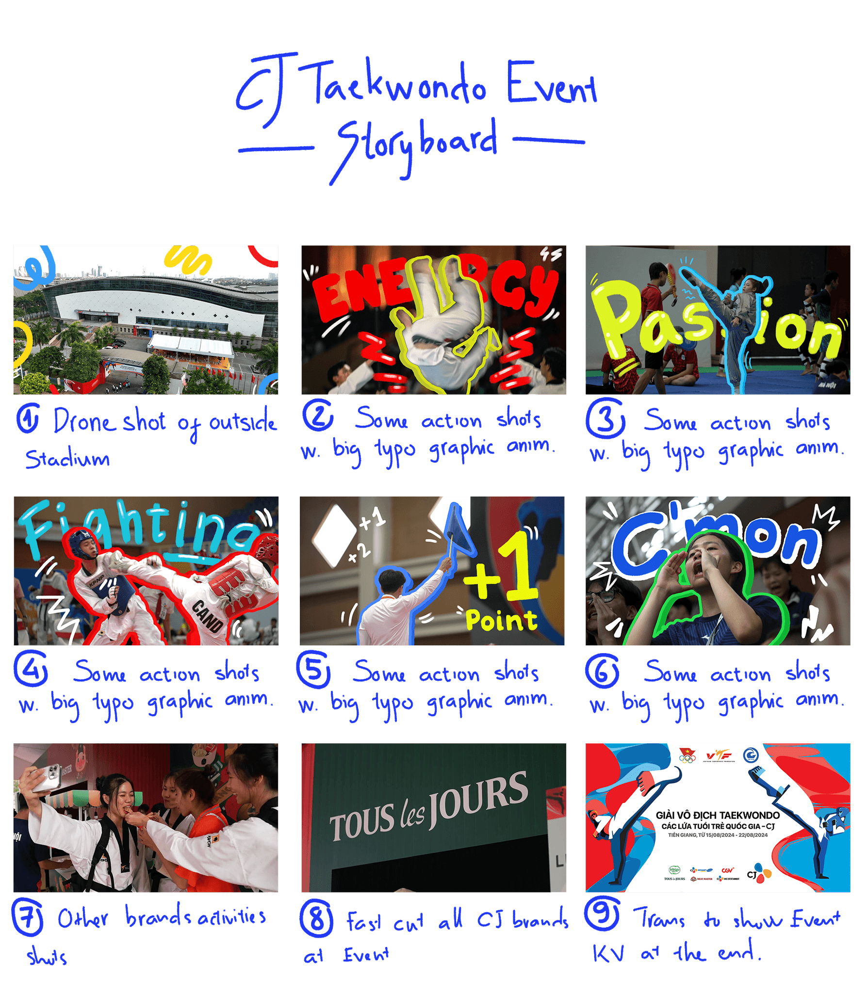 The teaser is an essential part of the promotional campaign for the annual Taekwondo event organized by CJ Group in Vietnam. Aimed at conveying energy, martial spirit, and community connection, the teaser will showcase impressive and dramatic footage of high-level martial arts performances, along with emotional moments of the athletes. Designed with a fast-paced rhythm, powerful music, and eye-catching visual effects to capture attention and spread the passion for Taekwondo to a wide audience.